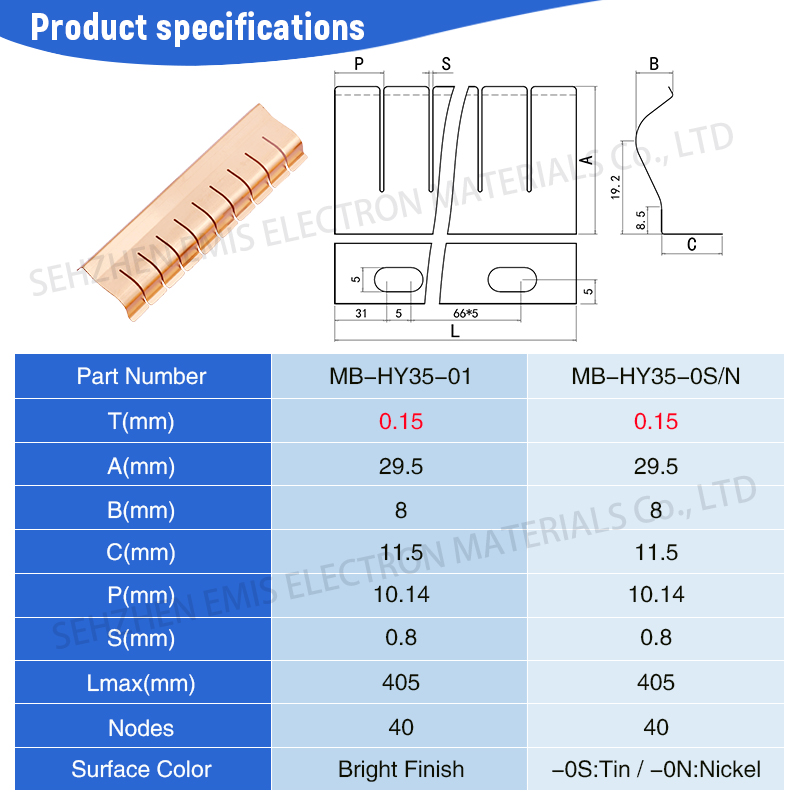 Max Length: 405mm.BeCu Thickness:0.15mm .Standard Length: 405mm.Standard Nodes:40 Pitches.-01: Bright Finish.-0N:Nickel Plated.Width A size: 29.5mm.Height B Size:8mm.